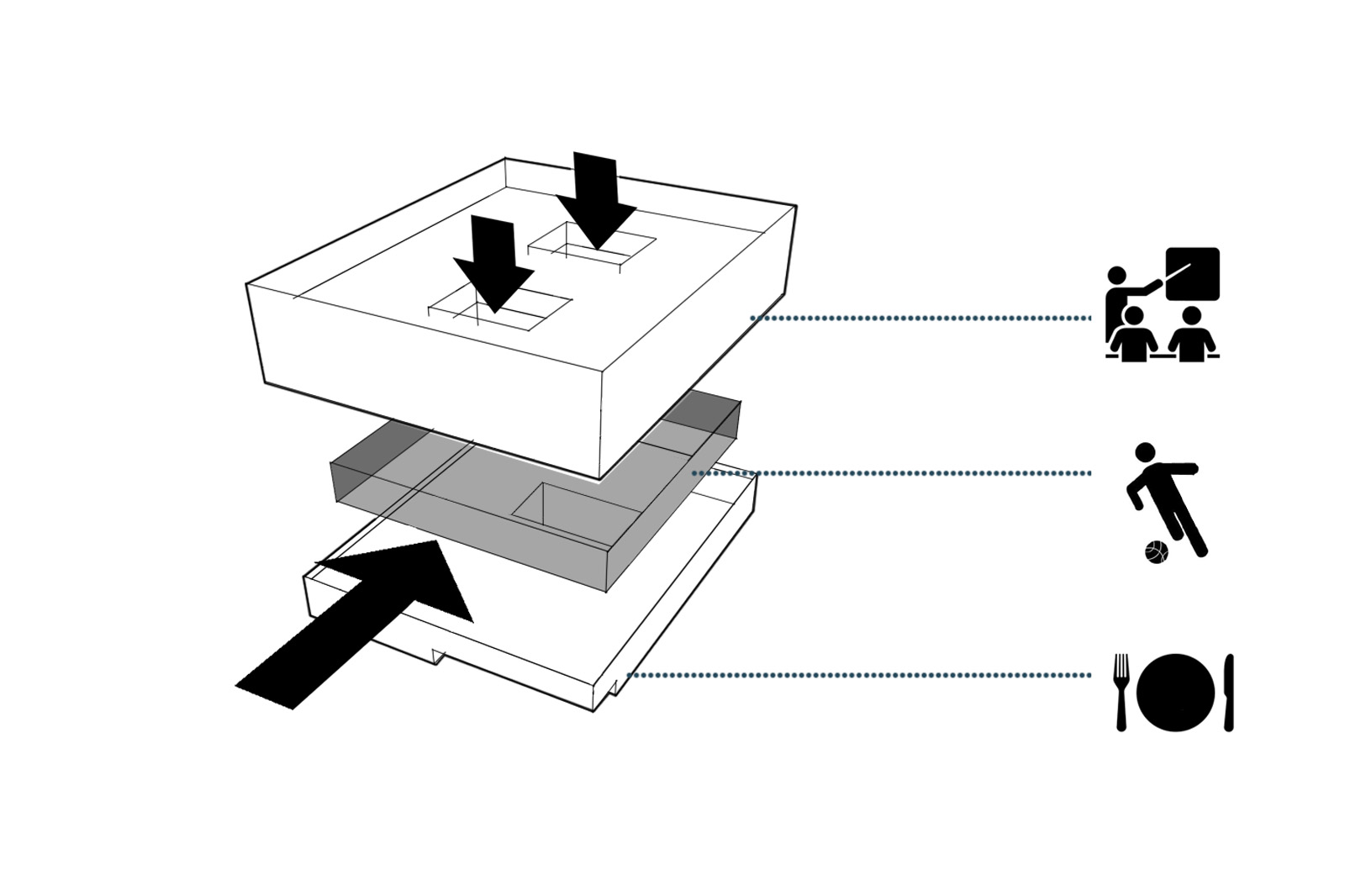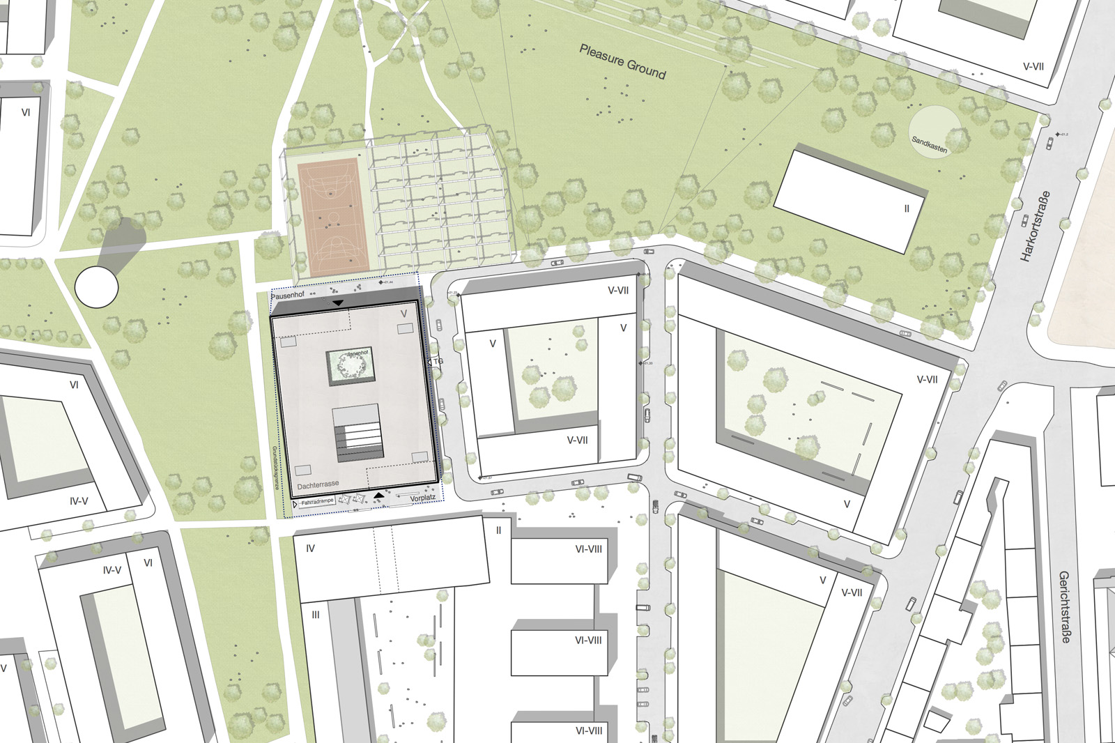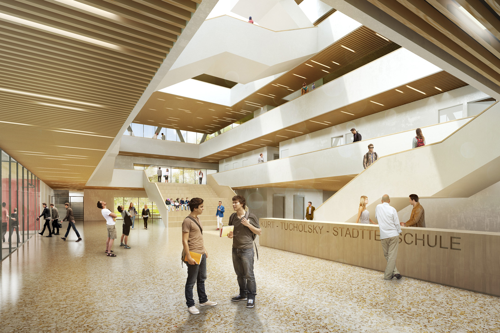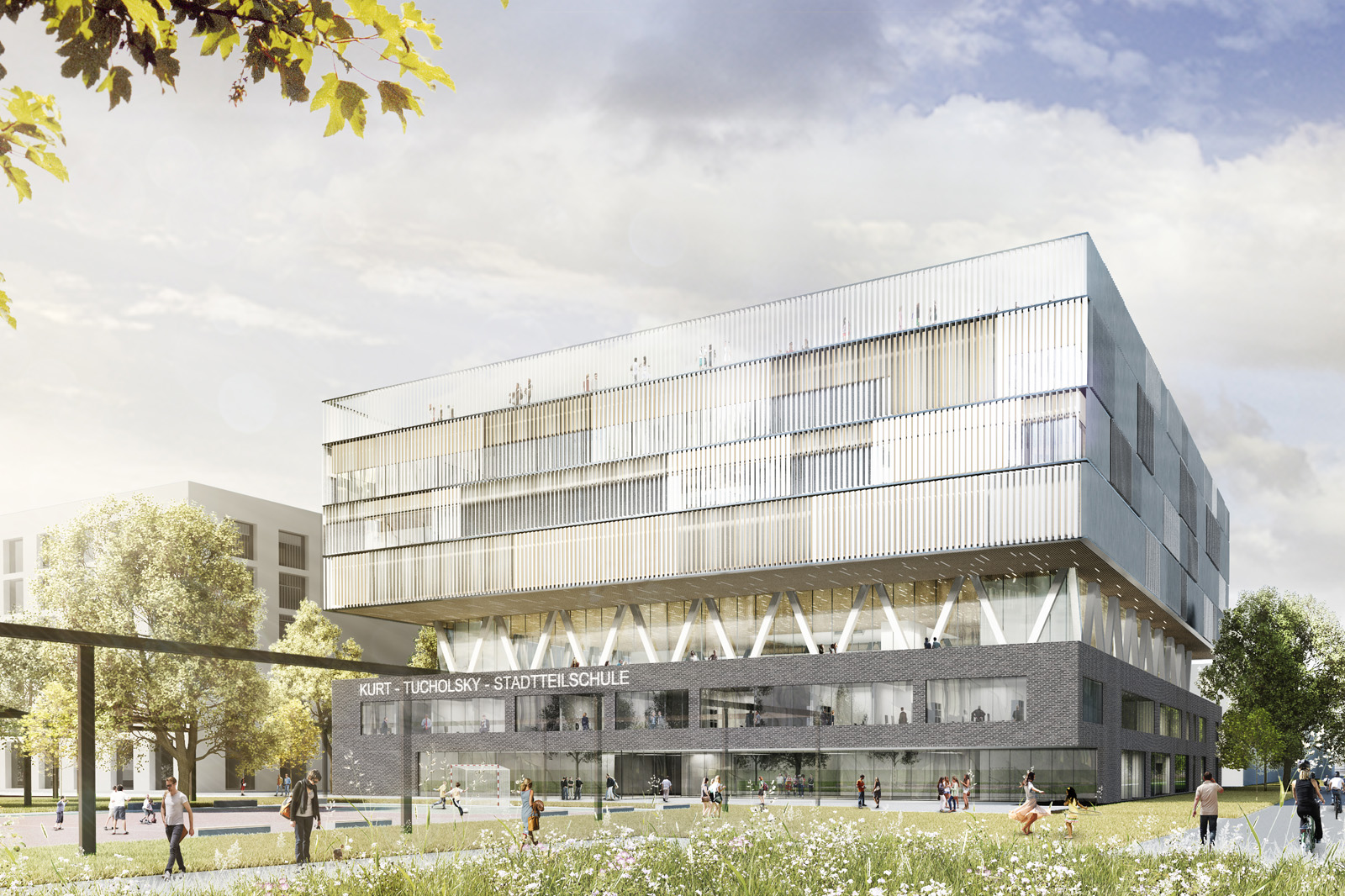 Mit der zentralen Lage innerhalb der Neuen Mitte Altona kommt dem Neubau der Stadtteilschule Mitte Altona eine besondere städtebauliche Bedeutung zu. Im vollständigen Ausbau ist auf dem markanten Eckgrundstück am Park eine Sichtbarkeit aus dem ganzen Quartier gegeben. Zudem soll statt eines reinen Funktionsbaus ein Gebäude mit innovativem Raumangebot in einer besonderen Atmosphäre für zeitgemäße Lehr- und Lernmethoden und ein Ort für nachbarschaftliche Begegnung entstehen. Der Entwurf positioniert sich zu dieser Rolle durch eine selbstbewusste Geste und setzt sich in seiner Kubatur bewusst von der umgebenden Bebauung ab. Die Nutzungen werden lesbar, die Differenzierung zwischen Wohnbebauung und dem öffentlichen Baukörper der Stadtteilschule Mitte Altona erkennbar. So trägt der Neubau zu einer Strukturierung des städtischen Umfelds bei. Die Kubatur spiegelt die inneren Organisation des Baukörpers wieder. Der öffentliche, von den Anwohner und der Gemeinschaft mitbenutzte Sockel verbindet Quartier und Schulgebäude. Die transparent gehaltene ’Fuge’ gliedert den Baukörper in einen Sockel mit den gemeinschaftlichen Nutzungen und die rein schulischen Bereiche, die als in sich geschlossenes Volumen über Sockel und Fuge ’schweben’. Die zentrale, lichtdurchflutete Halle bildet dabei die „gemeinsame Mitte“ der Schule, über die alle Geschosse und Funktionsbereiche bis zur Dachterrasse miteinander verbunden werden. Ein sichtbarer und lesbarer Ort der Bildung entsteht und bildet das Herz des neuen Stadtteils.