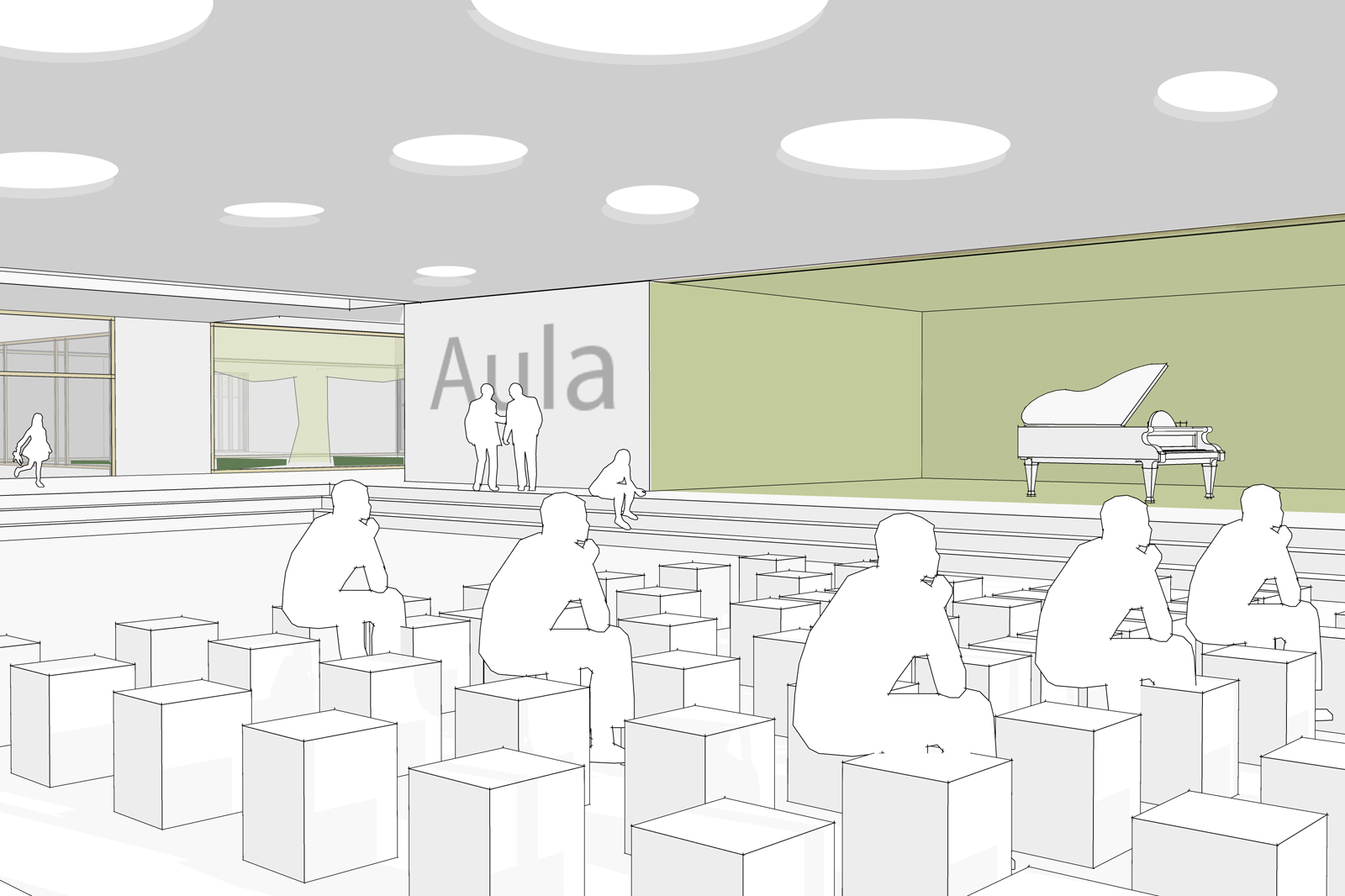 mit Unterrichtsräumen, Mensa, Aula