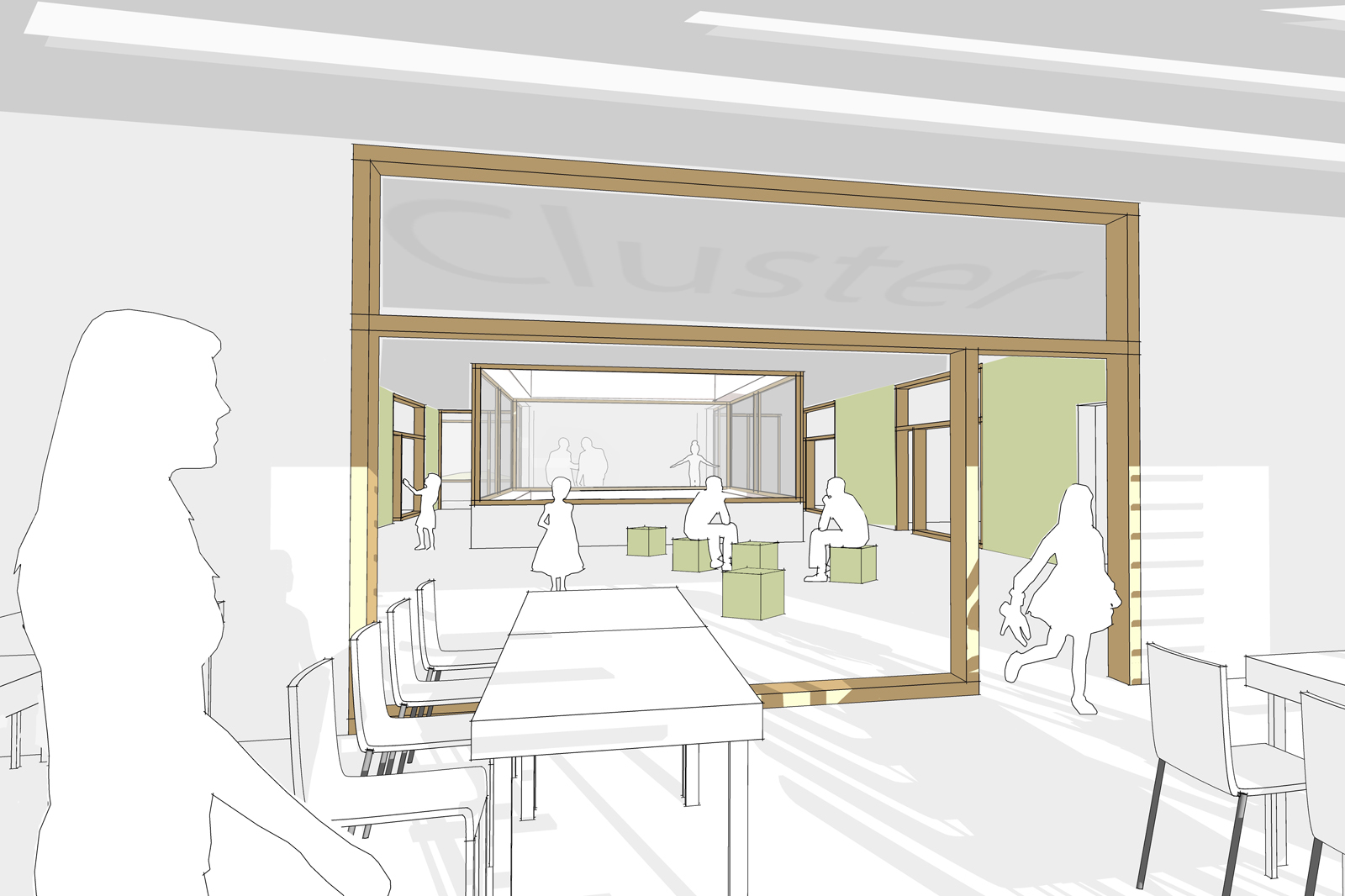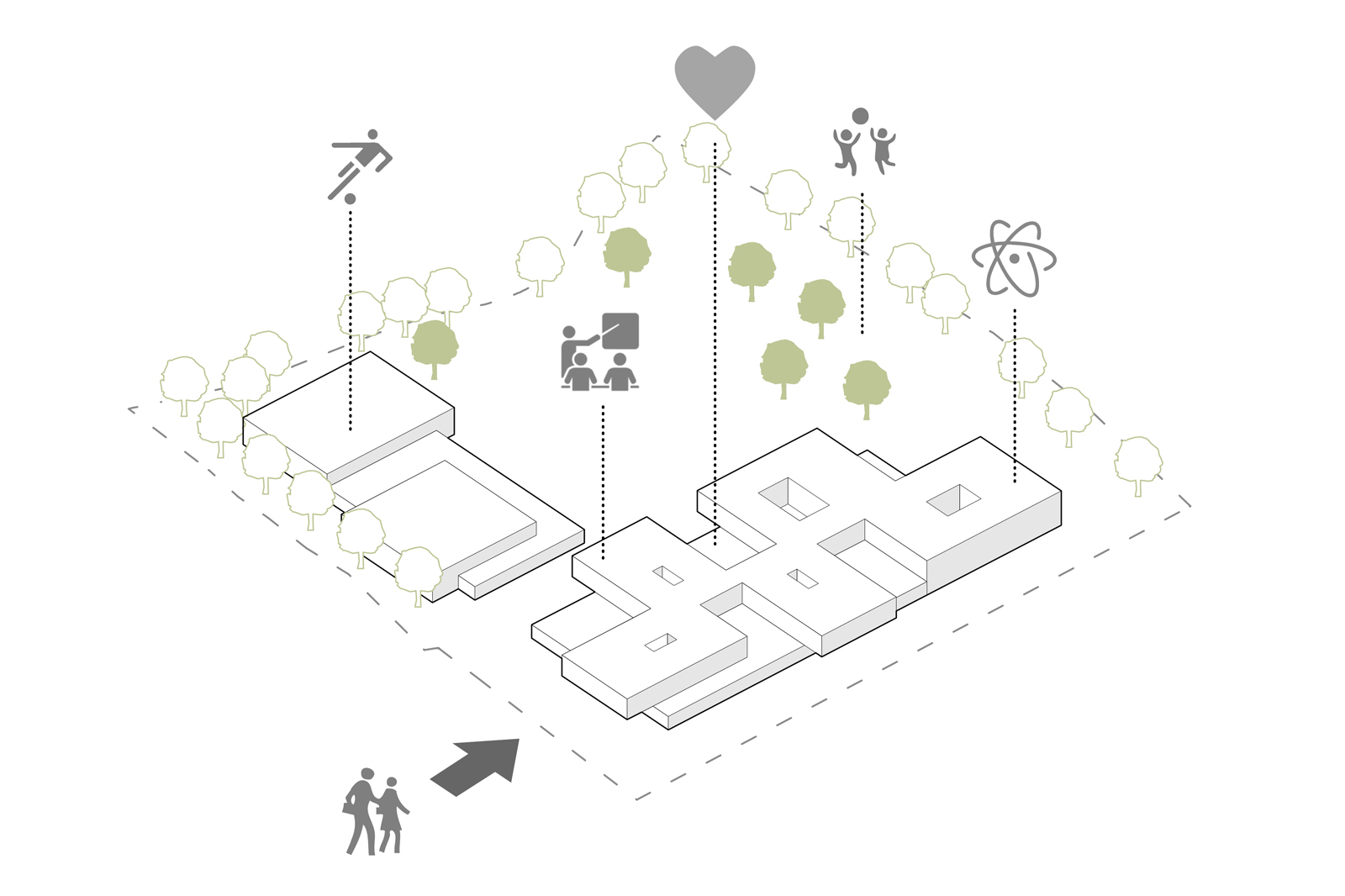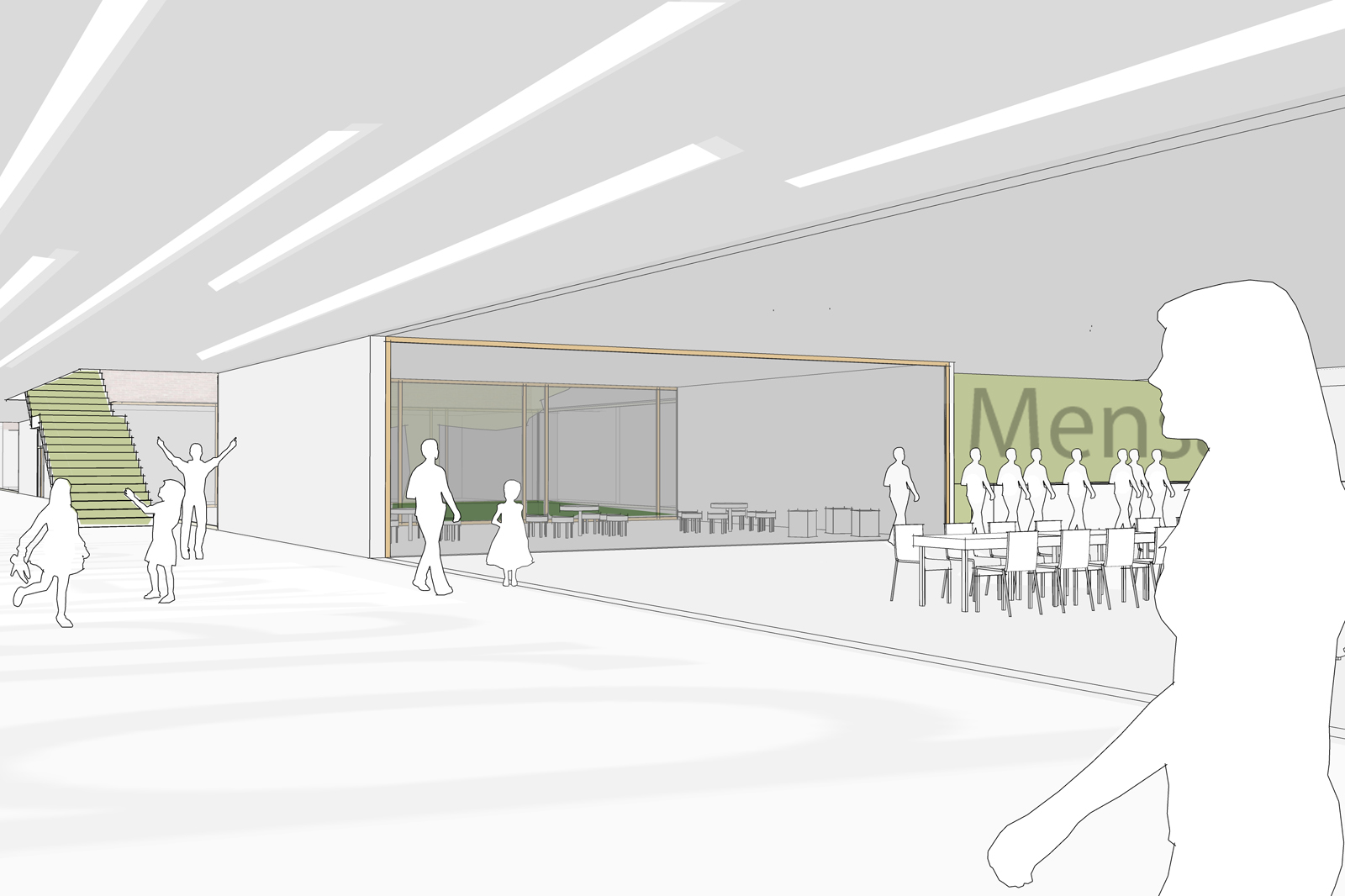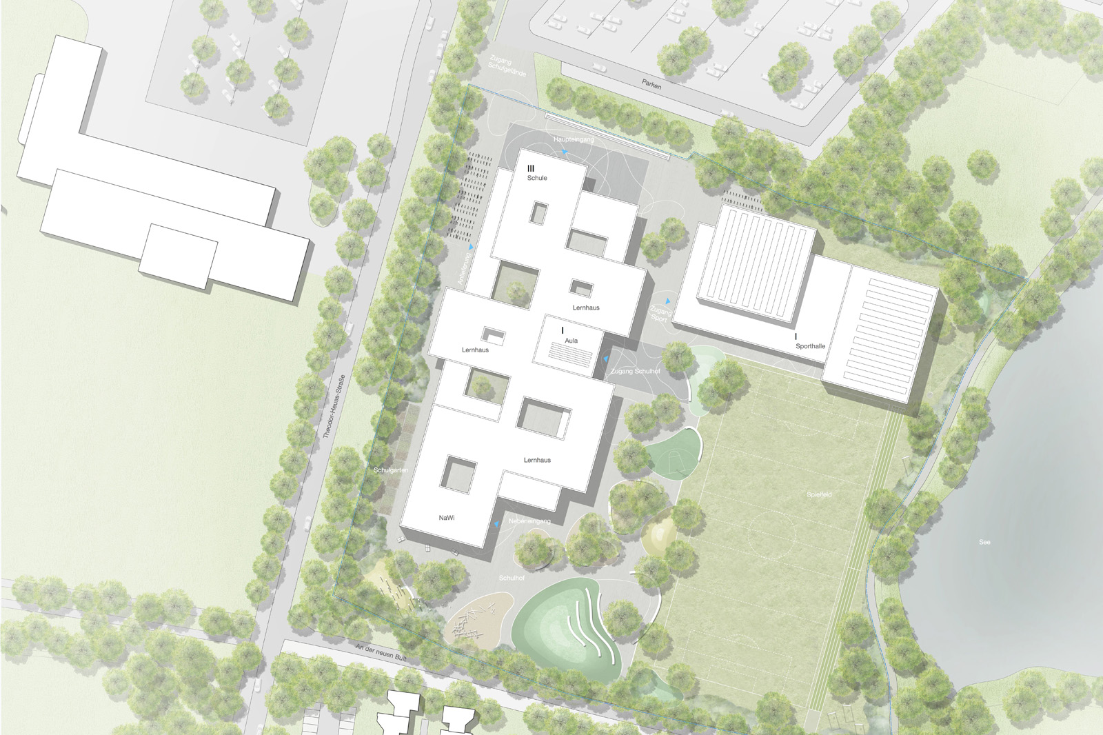 Die grundlegende, sehr gute städtebauliche Idee ist das Herunterbrechen eines großen Gebäudevolumens in kleinteilige, inhaltlich definierte Cluster unter Beibehaltung des wesentlichen Baumbestandes sowie einer deutlichen Orientierung zum See. Die zweite wunderbare Grundidee ist der Schulboulevard, der im EG komplett von Nord nach Süd über die gesamte Gebäudelänge verläuft und an dem alle Funktionen öffentlicher (Mensa, Au- la/Zentrale Mitte, Bibliothek, Ganztag) und halböffentlicher Art (Konferenzraum, Cafeteria, Berufsinfo etc.) angegliedert sind.