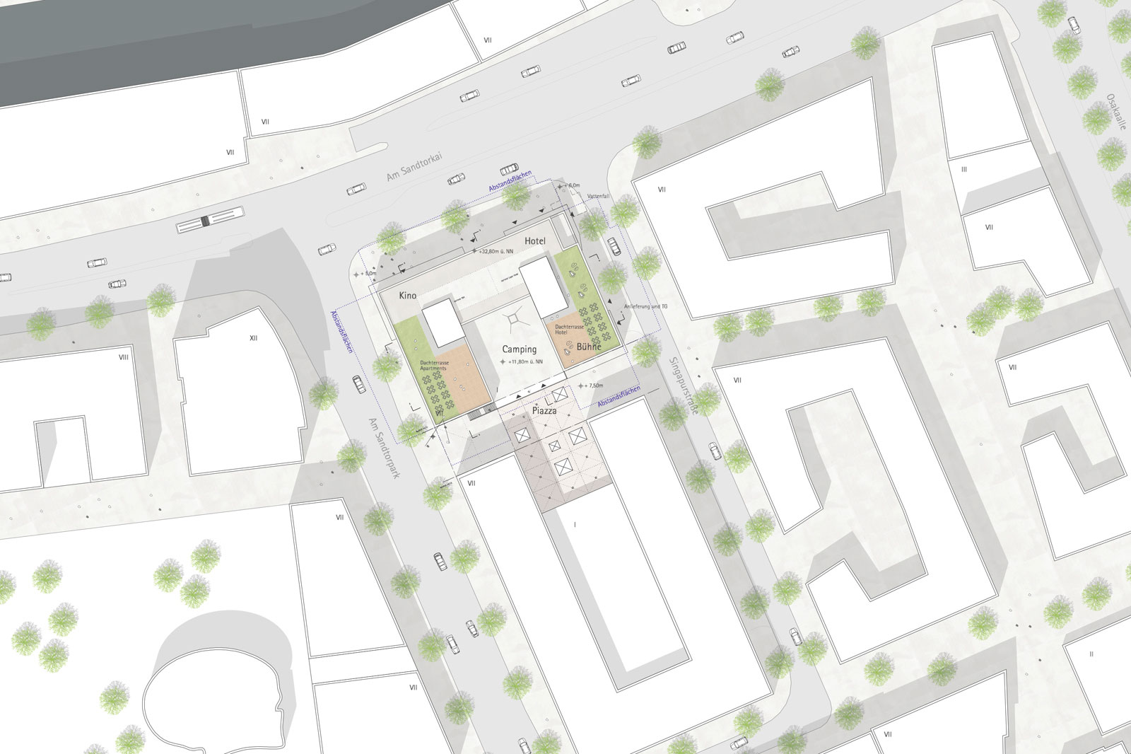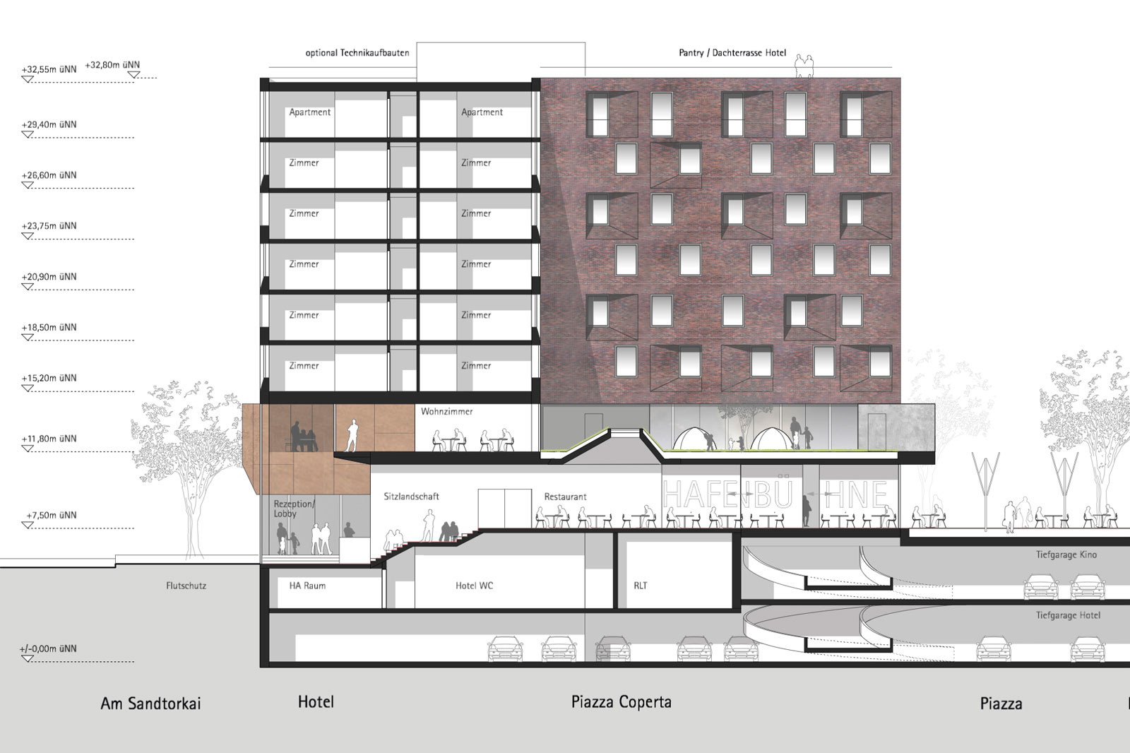 Neben der Akzentuierung des Ortes, ist das Hauptanliegen des Entwurfs einen öffentlichen Ort zu schaffen. An die geplante Piazza im Süden des Grundstücks, die um eine mobile Bühne, Sitzmöglichkeiten im Freien, und einer temporären Überdachung in Form von Faltschirmen ergänzt wird, schließt im Gebäude die Piazza Coperta an. Diese verlängert den Außenraum in das Gebäude hinein und schafft eine fließende stadträumliche Verbindung von Piazza und den einzelnen Foyers am Sandtorkai. Das Erdgeschoss wird durchlässig, hell und großzügig. So schafft es zum Einen eine fließende Verbindung der einzelnen Höhenebenen (Piazza auf +7,50m üNN, Foyers auf +5,00m üNN bis 6,00m üNN), zum Anderen bietet es Raum, der auf unterschiedlichste Weise von den einzelnen Parteien bespielt werden kann - gemeinsam, unabhängig oder in Kooperationen mit Anderen. Die Möglichkeiten sind vielfältig. Die bauliche Trennung der jeweiligen Nutzungen ist in Form eines raumhohen Möbels gegeben. Dieses nimmt Bar und Counter auf der Astorseite, sowie die Showküche und das Buffet auf der Hotelseite auf, und schafft auf beiden Seiten neue Sitzmöglichkeiten in der Foyerlandschaft. Die Grenzen der Nutzungen sind klar definiert und unabhängig voneinander, ohne das die Offenheit und Großzügigkeit der Foyerlandschaft beeinträchtigt wird. Die Foyers, zum Sandtorkai hin orientiert, folgen dem Straßenverlauf. Bieten den Zugang zu Hotel und dem Astor Kino. Fahrstühle gewährleisten, dass jedes Höhenniveau barrierefrei erreicht werden kann. Die Hafenbühne orientiert sich zur Piazza hin und stärkt so den öffentlichen Charakter des neu geschaffenen Ortes. Vorder- und Rückseite des Gebäudes werden gleichwertig. Durch ihre Anordnung innerhalb des Gebäudes und die interne Organisation kann die Hafenbühne sowohl als eigenständiger Ort für Kultur, Konzerte oder Lesungen dienen, sowie als Erweiterungsfläche des Restaurantbereichs herangezogen werden.