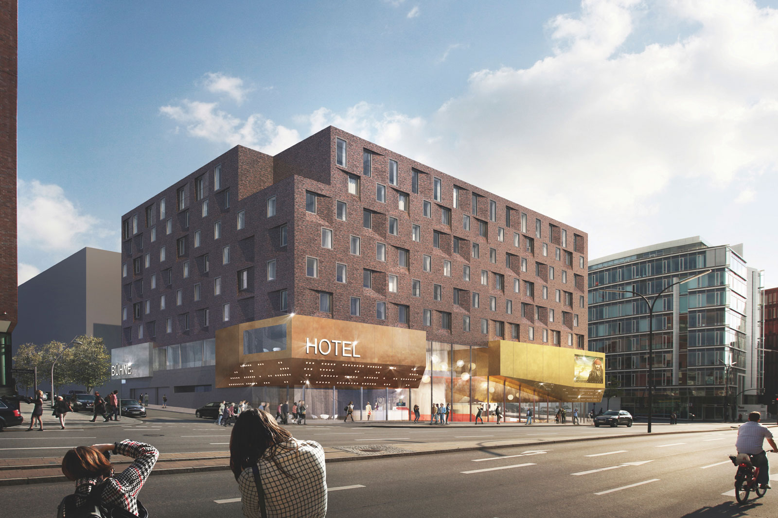 Das Gebäude besitzt in den Obergeschossen eine Fassade aus rotem Backstein. Die Fensterlaibungen werden teilweise aufgeweitet und erhalten eine plastische Gestalt. Durch diese Maßnahme bleibt das Volumen des Baukörpers in den Obergeschossen klar ablesbar, die Gestalt präsent. Zudem vermittelt die Fassade eine spielerische Großzügigkeit, ohne dabei für den Hotelbetrieb unpassende Fensterformate vorzuschlagen. Eine natürliche Fensterlüftung ist in den einzelnen Hotelzimmern möglich. Das Erdgeschoss ist mit seiner Verglasung klar der öffentlichste Teil des Gebäudes. Die eingestellten, schwebenden Kulturboxen der Kinosäle, der Lounge und der Hafenbühne sind mit ihren Metallfassaden in unterschiedlichen Farbtönen klar zu erkennen und transportieren die innere Nutzung leicht lesbar in den Straßenraum. Während die Metallkörper sich in ihrer Plastizität nach außen entwickeln und so neben der Signalwirkung auch die nötigen Vordächer erzeugen, springen die betonten Fenster in den Hotelgeschossen zurück.