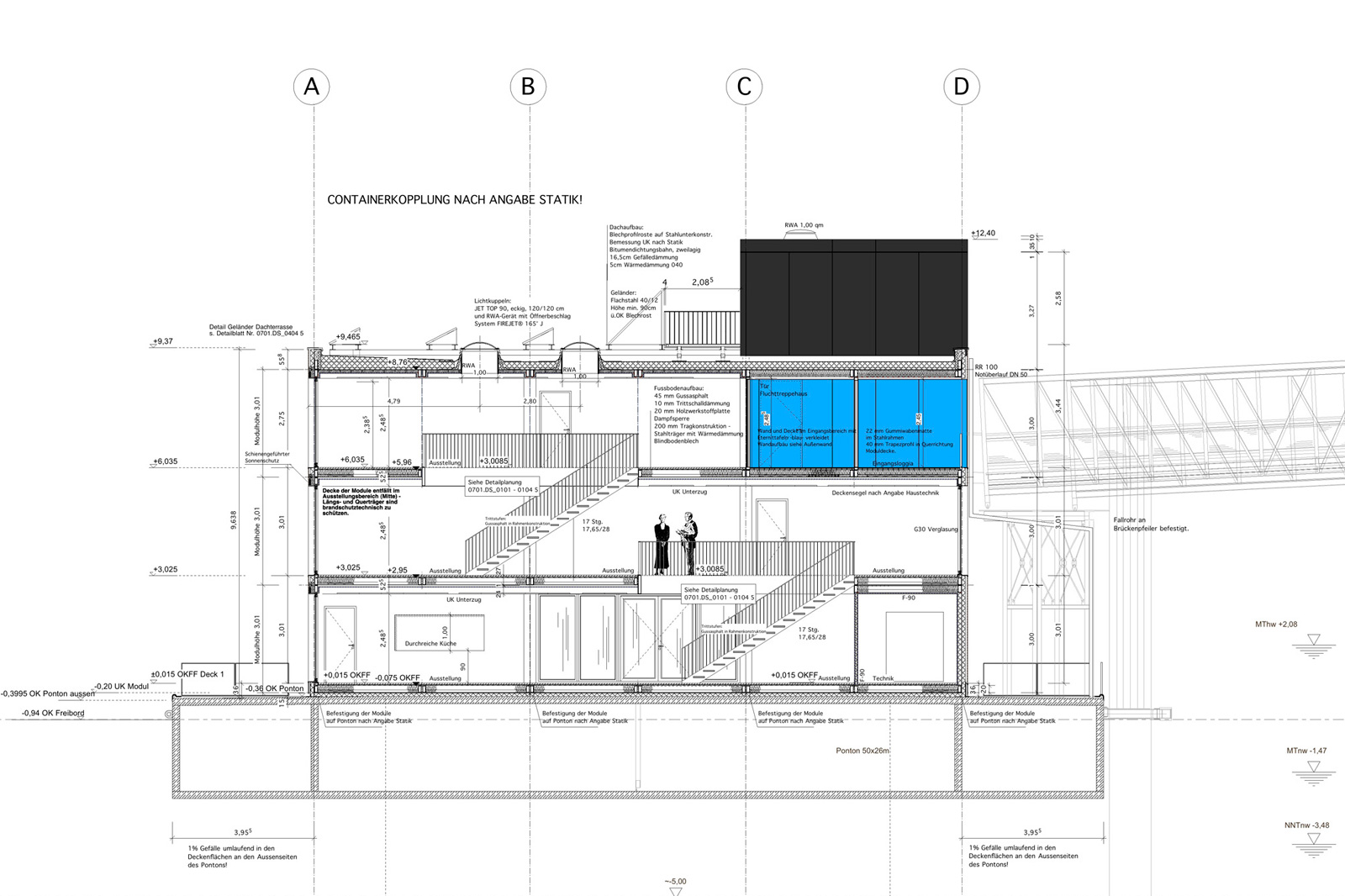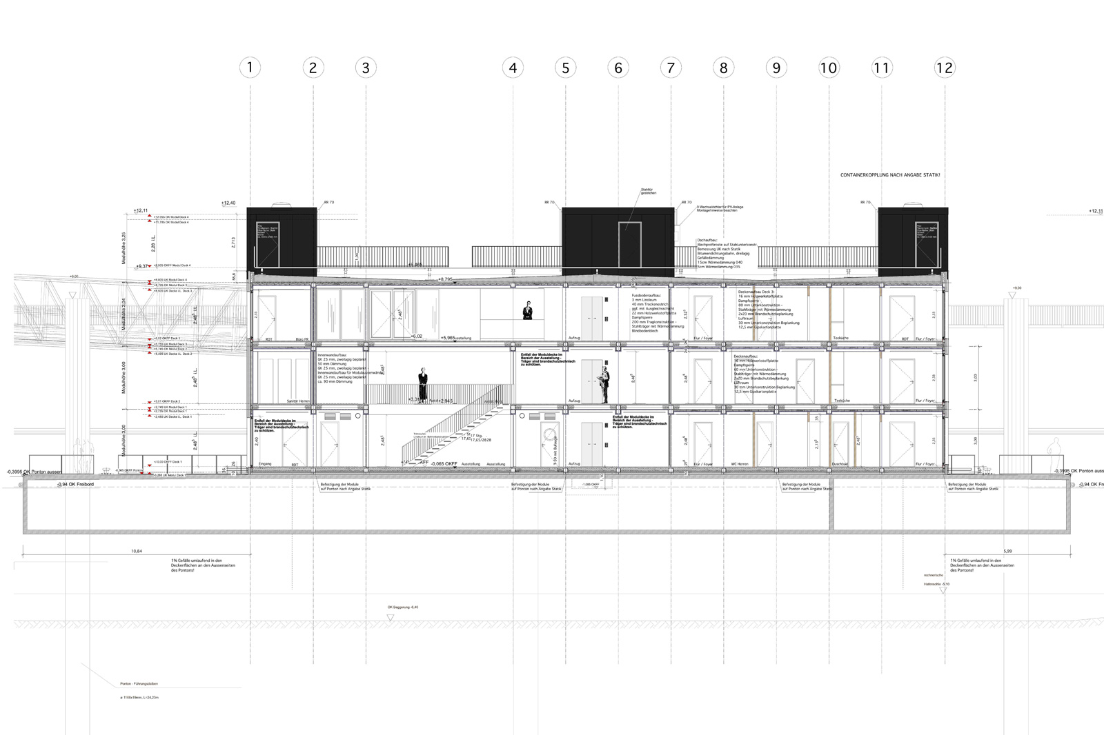 Ein weiterer wichtiger Aspekt des IBA DOCK: Es steht für einen neuen Umgang mit der Hochwassergefahr: Der Ponton ist an Dalben befestigt, an denen er sich mit der Tide täglich 3,5 Meter auf und ab bewegt. Sollte eine starke Sturmflut kommen, schwimmt das IBA DOCK mit dem Wasser auf. Statt immer höherer Deiche passt sich das Gebäude der Natur an - ein zukunftsweisendes Konzept für das Bauen in Hochwasserlagen.