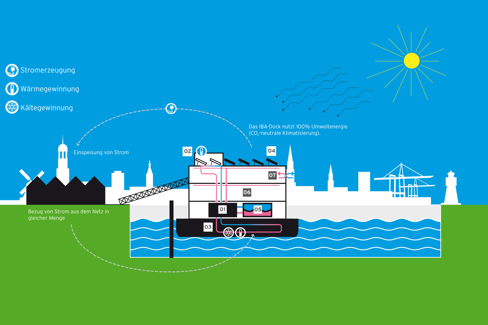 Wie alle IBA-Bauprojekte setzt auch das IBA DOCK in Sachen Klimaschutz Standards: zusätzlich zu 25 cm stark gedämmten Außenwänden nutzt das IBA DOCK Sonne und das Wasser der Elbe zur Energiegewinnung. Eine Sole/Wasser-Elektro-Wärmepumpe beheizt das Gebäude. Die von der Wärmepumpe benötigte Umweltwärme wird durch einen im Boden des Betonpontons integrierten Wärmetauscher der Elbe entnommen und / oder von Solarthermiekollektoren geliefert. Der Strombedarf der Wärmepumpe wird durch eine Photovoltaikanlage auf dem IBA DOCK bilanziell gedeckt. Weitere Kühl- oder Heizenergie wird nicht benötigt.