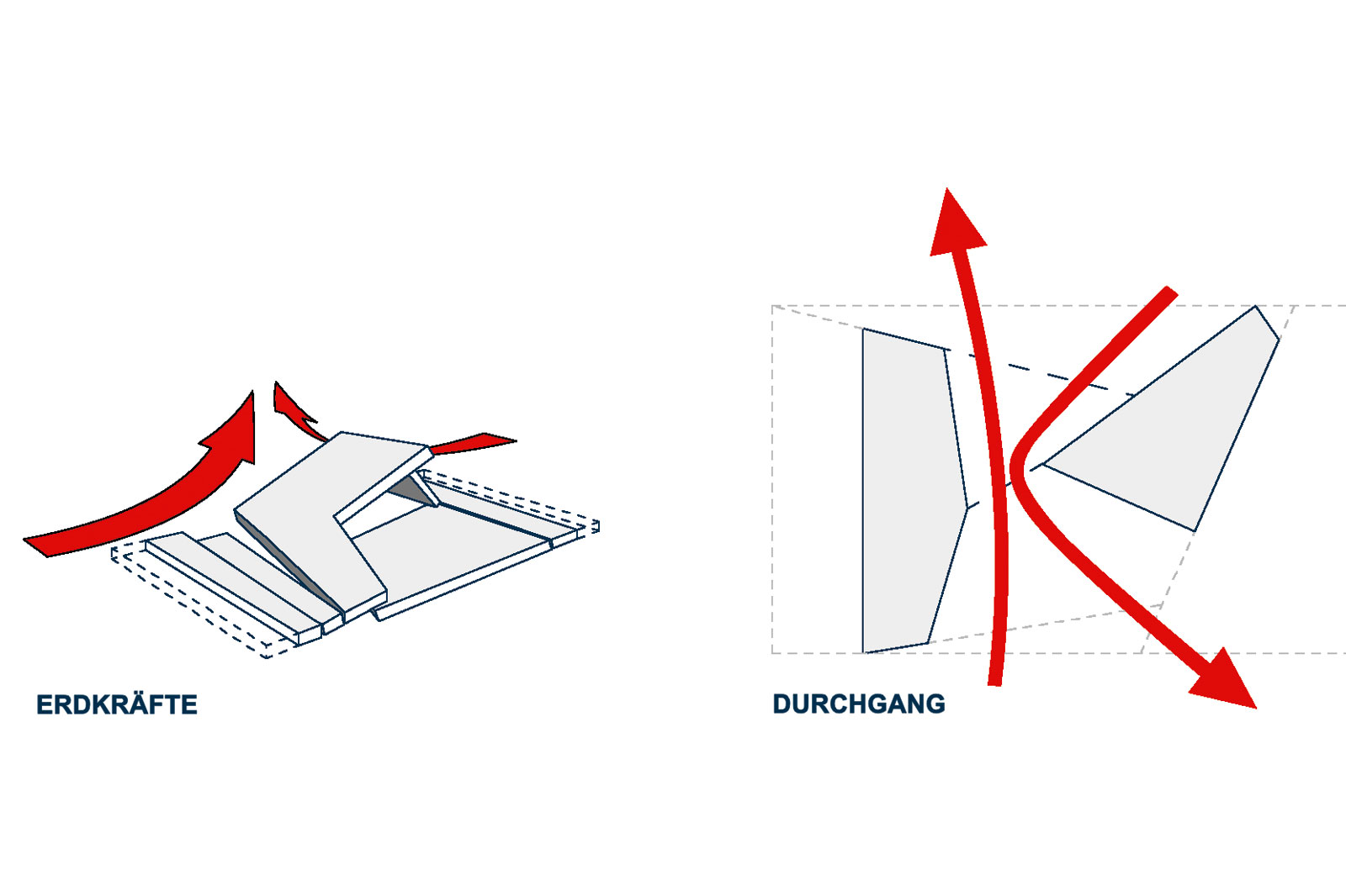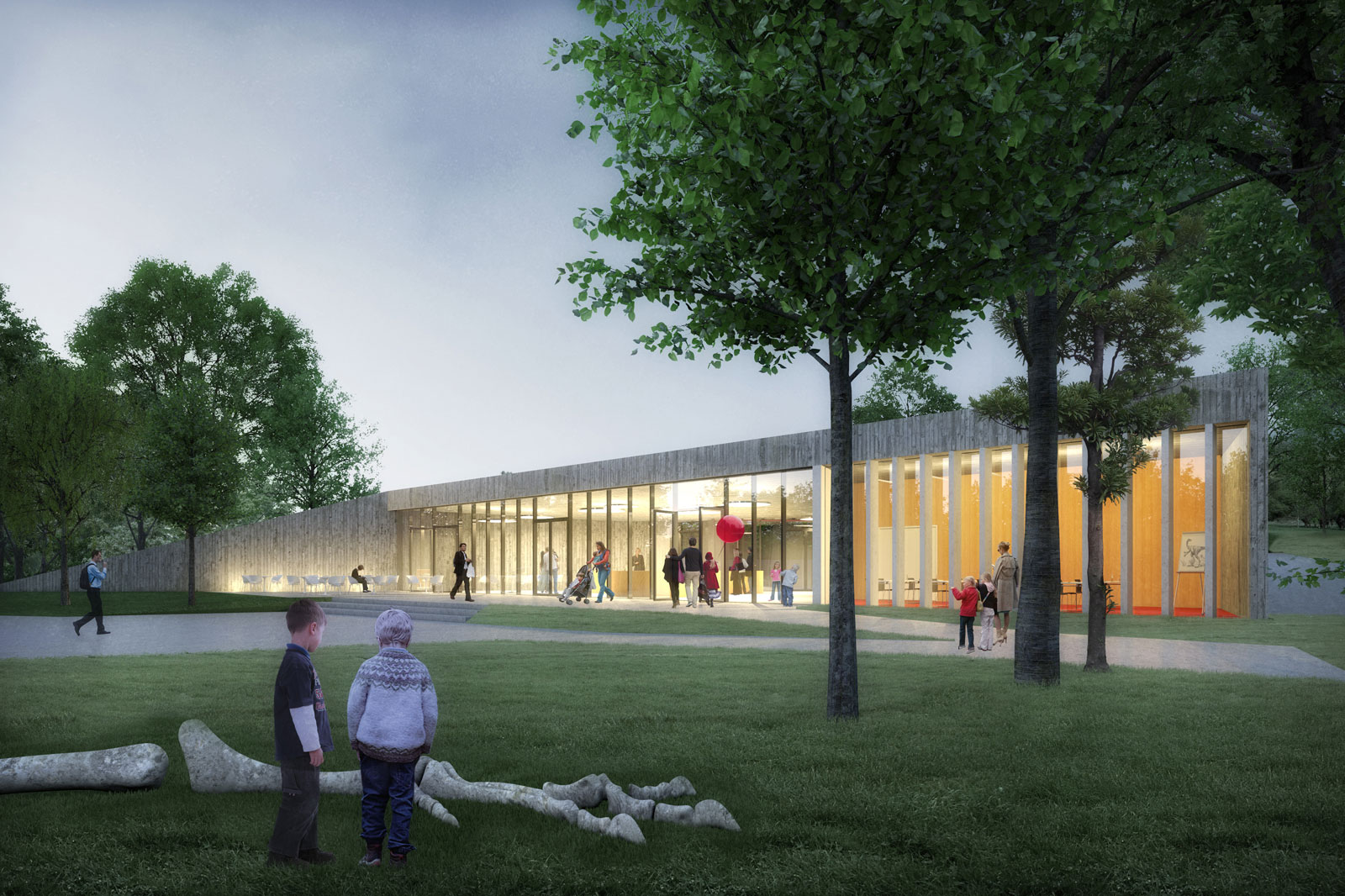 Bei der Gestaltung des neuen Zugangsgebäudes wird diese Situation genutzt. Der Besucher geht zum Waldstück hin, kann aber nur erahnen, was sich darin verbirgt. Das Eingangsgebäude tritt nicht im eigentlichen Sinne als Gebäude in Erscheinung, sondern erhält die Form von aufgeworfener Erdkruste. Tektonische Erdbewegungen haben die oberen Schichten des Erdmantels zu einem höhlenartigen Durchgang geformt, durch die das geheimnisvolle Waldstück erreichbar wird. Der Besucher erkennt die sich aus dem Boden entwickelnde Form und wird auf selbstverständliche Weise zum Durchgang in den Park geleitet. Dabei wird die vorhandene abfallende Topografie geschickt genutzt und der Effekt des Passierens eines Höhlenzugangs verstärkt. Unter der massiven Gesteinsplatte des Durchganges ist der Eingang mit den angeschlossenen Funktionen angeordnet. Der Weg führt dann auf der Nordseite des Durchganges ebenerdig weiter in den Saurierpark. Die Zuwegung veranschaulicht dadurch ganz erlebbar die Kräfte der Natur und nimmt den Besucher mit auf die Zeitreise in ein ferne Vergangenheit. Die Wegeführung ist sanft und selbstverständlich, aber auch eindrucksvoll, so dass die Anreise alsbald vergessen ist. Beim Eintreten wird die Bereitschaft geweckt, sich auf das Abenteuer Urzeit einzulassen.