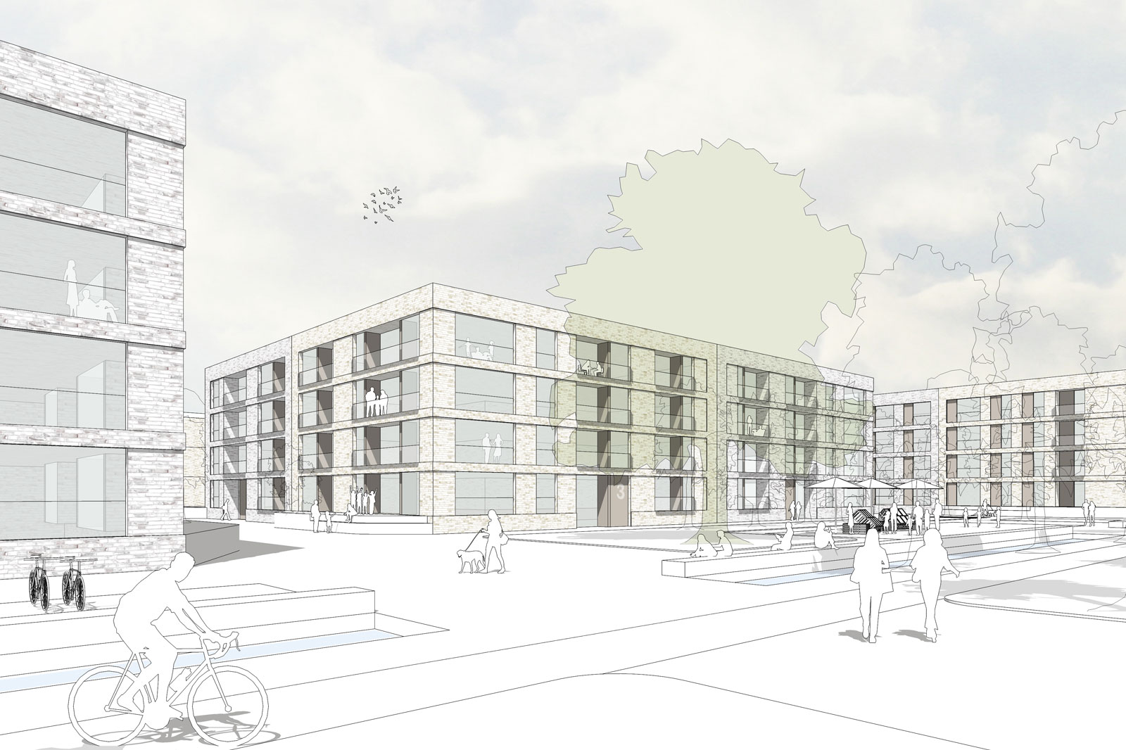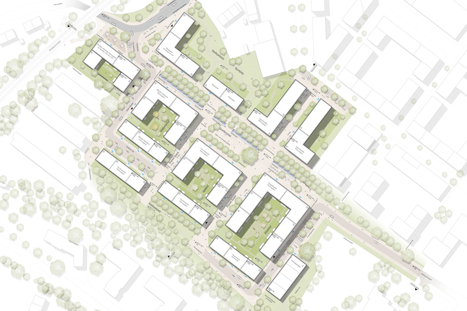 Nördlich hiervon wird die Blockstruktur mit Raum für Baugruppenprojekte und Bausteine Experimentellen Wohnens ergänzt. Der nordwestliche Eingang ins Quartier wird durch einen klar definierten Platz geschaffen. Hier befindet sich neben der Bündelung der unterschiedlichen Mobilitätsmöglichkeiten - Bahnhaltepunkt, Bushaltestelle, Car- und Bikesharing Punkte, auch Gewerbeflächen um die Nahversorgung auf dem Nachhauseweg abzudecken. Im Südosten des Grundstücks wird die KiTa des neuen Quartiers verortet. Durch die Nähe zur Bestandsschule und die direkte räumliche Anbindung werden gemeinsame Nutzungen und vielfältige Synergien zwischen beiden Bildungsstandorten möglich. Das Quartier bleibt durchgängig viergeschossig, ausschließlich die Zeilen im südlichen Bereich verringern sich auf eine Dreigeschossigkeit. So wird eine optimale Belichtungssituation geschaffen.