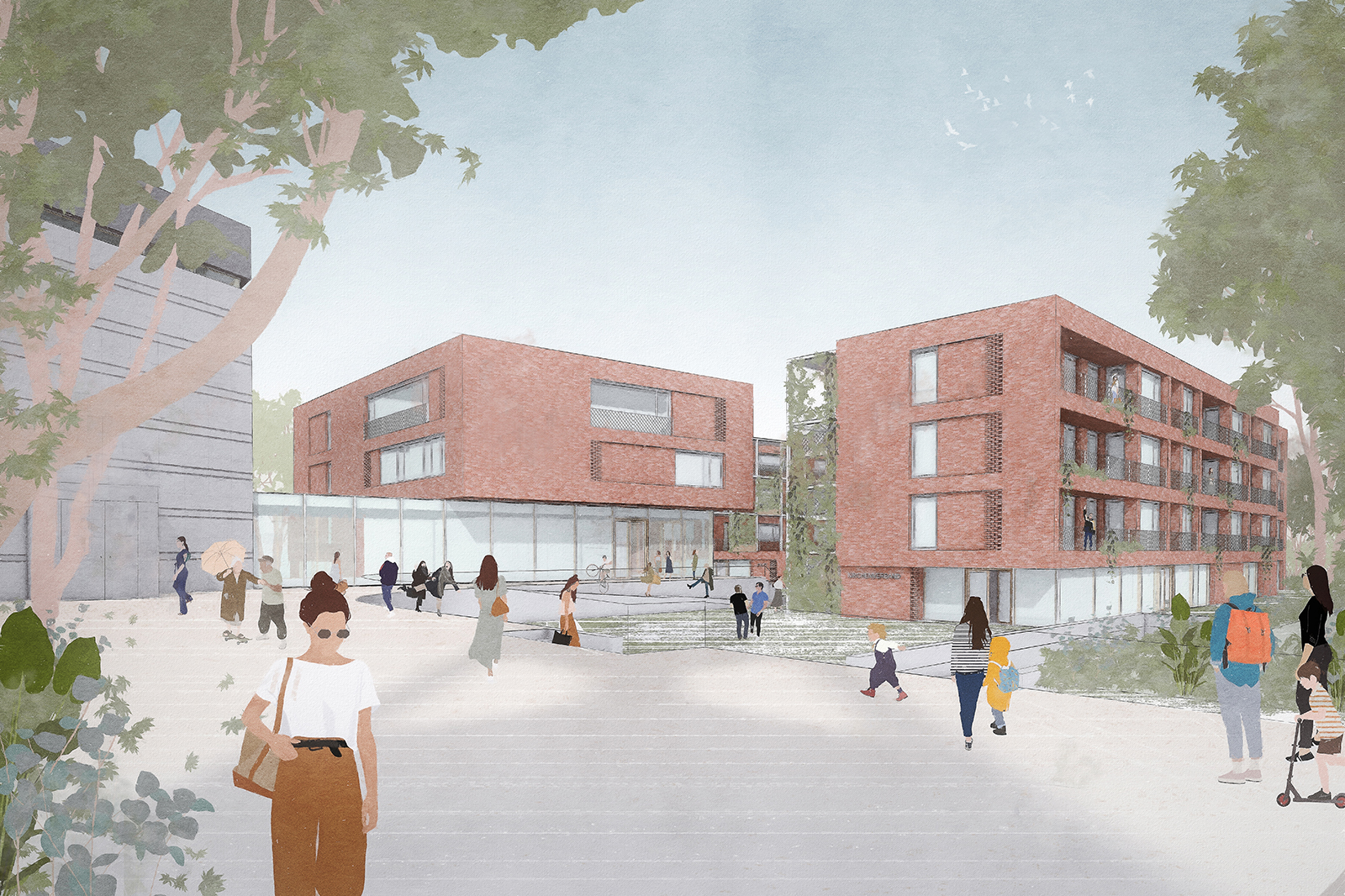 Nach außen berücksichtigen die Baukörper die auf dem Grundstück gegebenen Zwänge (Baumbestand im Nord-Osten / Abstand im Nord-Westen), während nach innen den Gebäuden jeweils ein „Grünes Gerüst“ vorgestellt wird. Dieses „Gerüst“ ist gleichermassen Erschliessung, wie auch zusätzlicher Aussenbereich der Wohnungen. Ein Bereich zur Kommunikation, zum Treffen und ein Plus für das gemeinschaftliche Leben. Hier entsteht ein nachbarschaftliches Miteinander der beiden gegenüberliegenden Gemeinden.