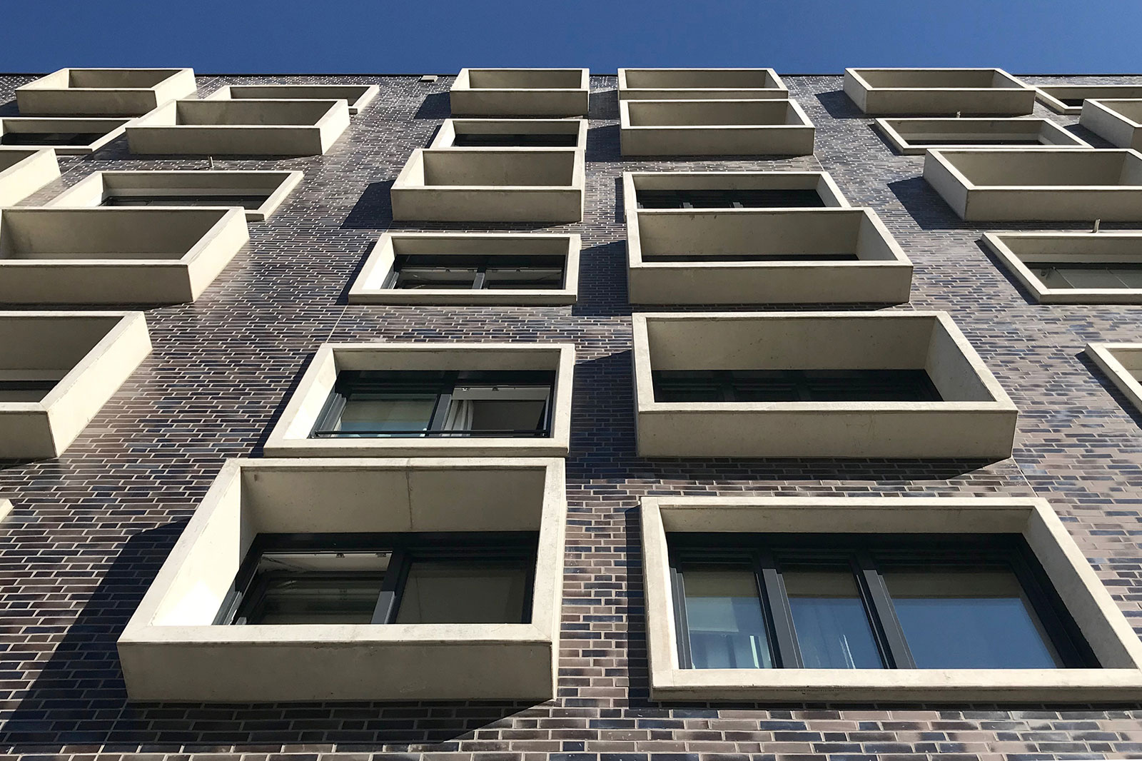In dieser Arbeit wird ein ebenmäßig gestalteter Baublock mit einer eher geschlossenen Fassade vorgeschlagen, was in Bezug auf die Lärmsituation an der Shanghaiallee verständlich ist. Die Fenster werden ansprechend in Vierergruppen zusammengefasst. Die Fensterlaibungen sind mit unterschiedlichen Tiefen versehen, so dass die Fensteröffnungen ein Spiel zwischen Vor- und Rücksprüngen thematisieren.