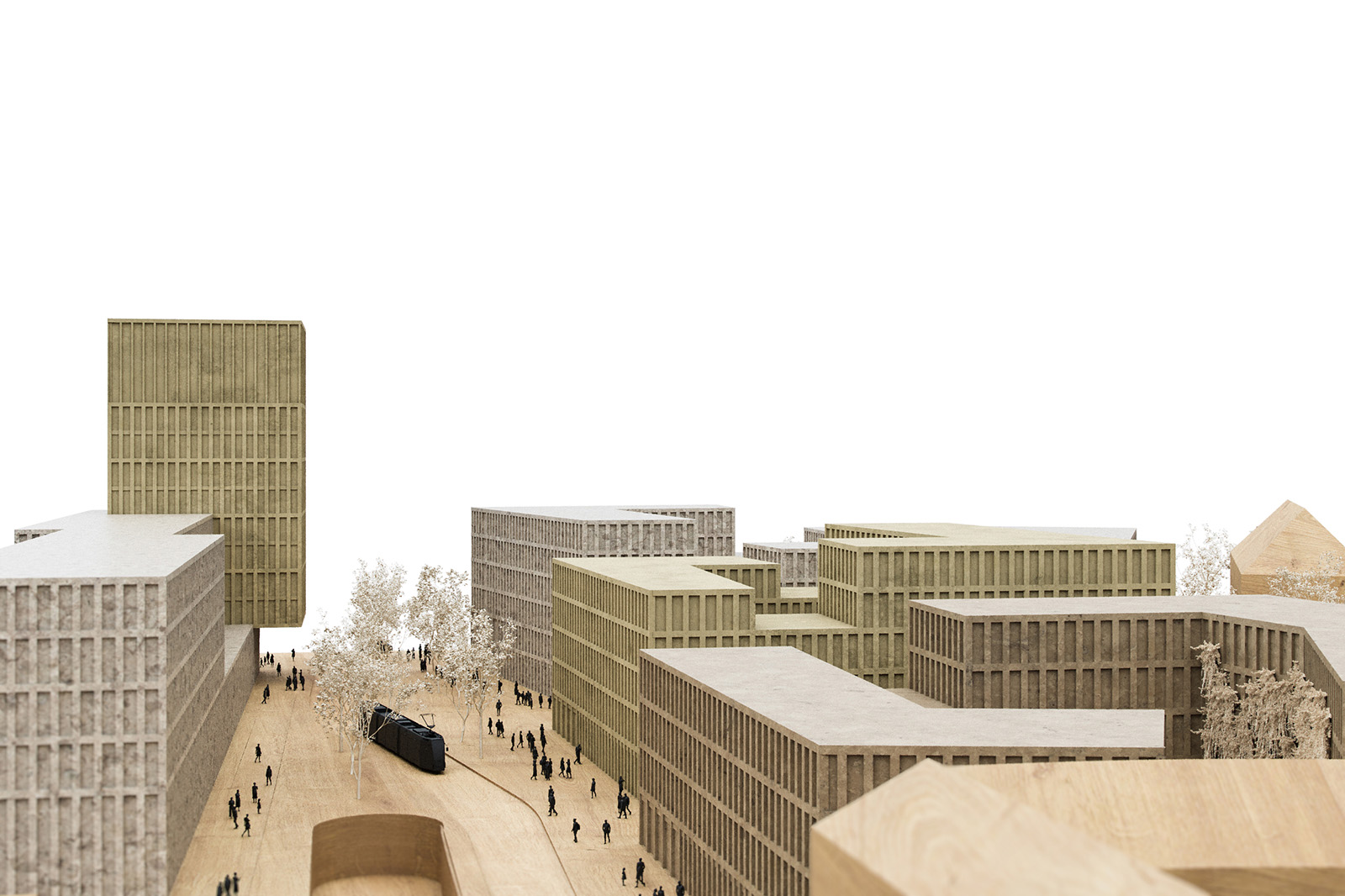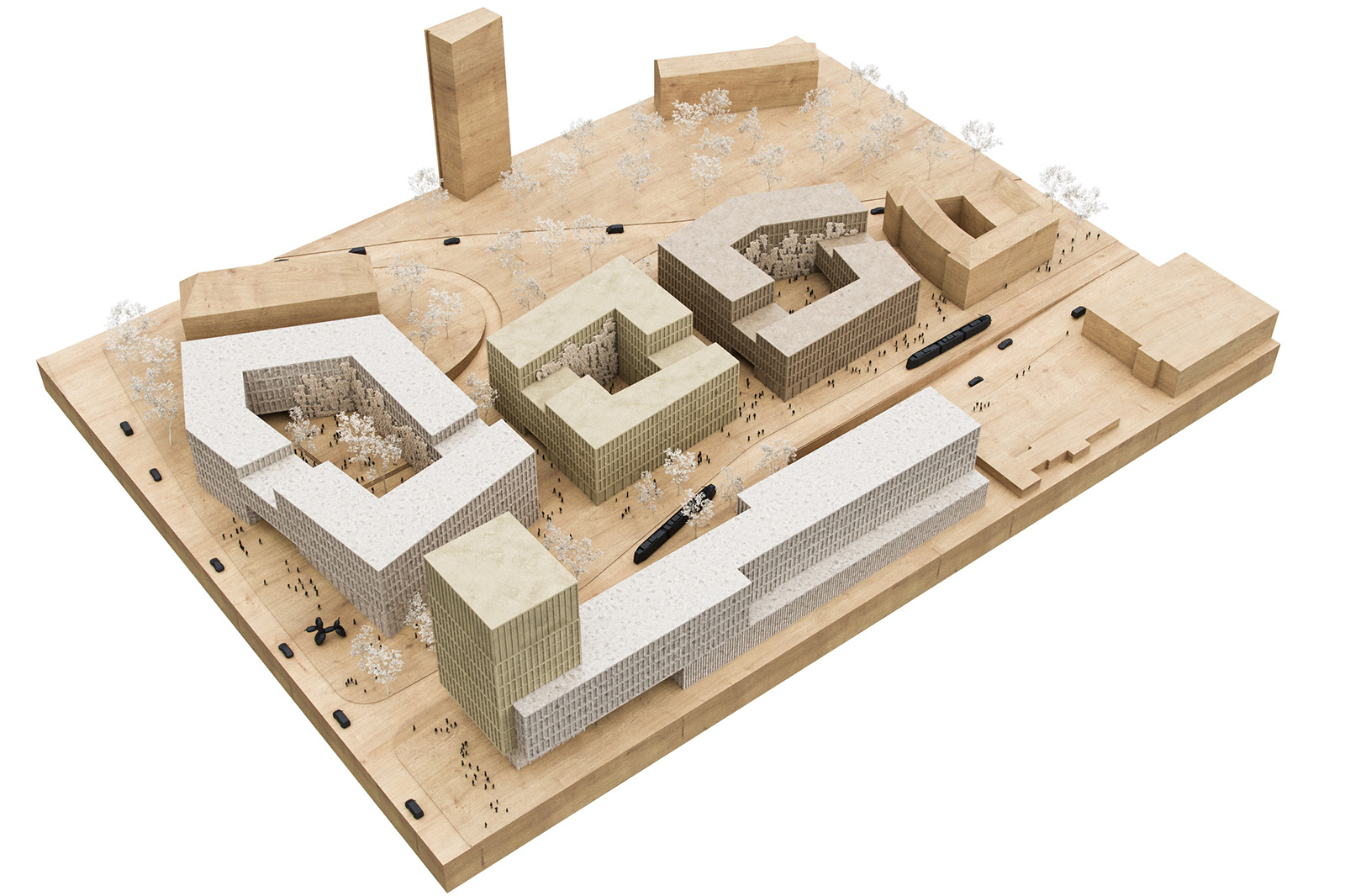 Unter diesen Umständen ist eine Struktur bestehend aus 3 Blöcken mit geschützten Innenbereichen / Höfen und einer langgestreckten Einzelbebauung entlang der Bahngleise sinnvoll. Die Blöcke wiederum bestehen aus einzelnen Segmenten mit unterschiedlicher Geschossigkeit, (Block A / St. Petersburger Hof: 6/5 Geschosse, Block B / Wiener Hof: 6/5 Geschosse, Block C / Sidonhof: 5/4 Geschosse) welche durch nochmalig abgesetzte Passstücke miteinander verbunden werden. Die Höhenstaffelung der Blöcke ist so gewählt, dass eine städtebaulich verträgliche Anbindung der Bestandsgebäude ermöglicht wird. Die Passstücke fungieren zudem als Durchgang zwischen den Blöcken und ermöglichen so eine mäandrierende, visuell sichtbare Verbindung der einzelnen Höfe.